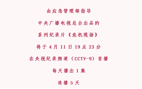 由应急管理部指导中央广播电视总台出品的系列纪录片《危机现场》将于4月11日19点23分在央视纪录频道(CCTV-9)首播每天播出1集、连播5天